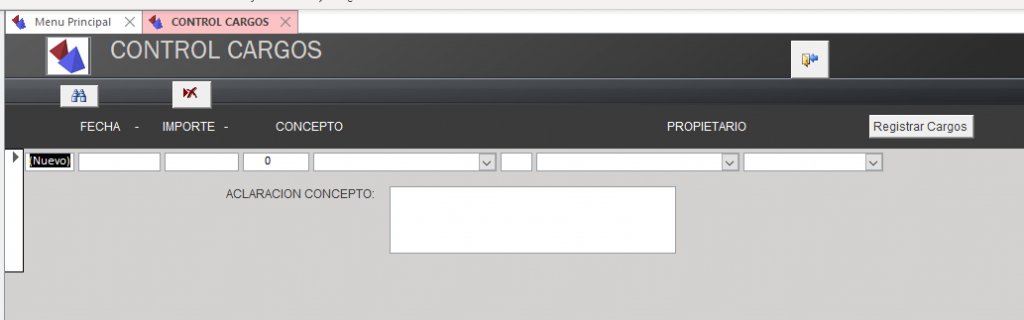 Desde este formulario se pueden realizar cargos individuales a cada propietario, se debe incluir la fecha, importe, concepto, propietario y aclaración del concepto si fuese necesario, un registro por cada propietario, una vez cumplimentados todos, pulsar sobre el botón REGISTRAR CARGOS, el programa realizará los cargos introducidos a cada uno de los propietarios que se hayan seleccionado.