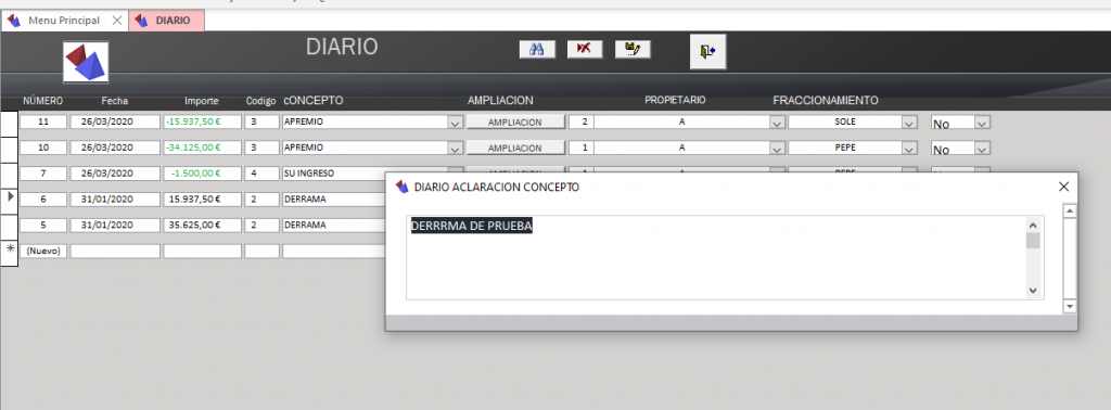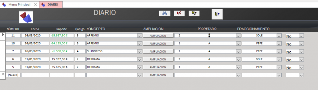 En esta ventana se introducirán los distintos abonos efectuados por los propietarios indicando los datos necesarios para su identificación.